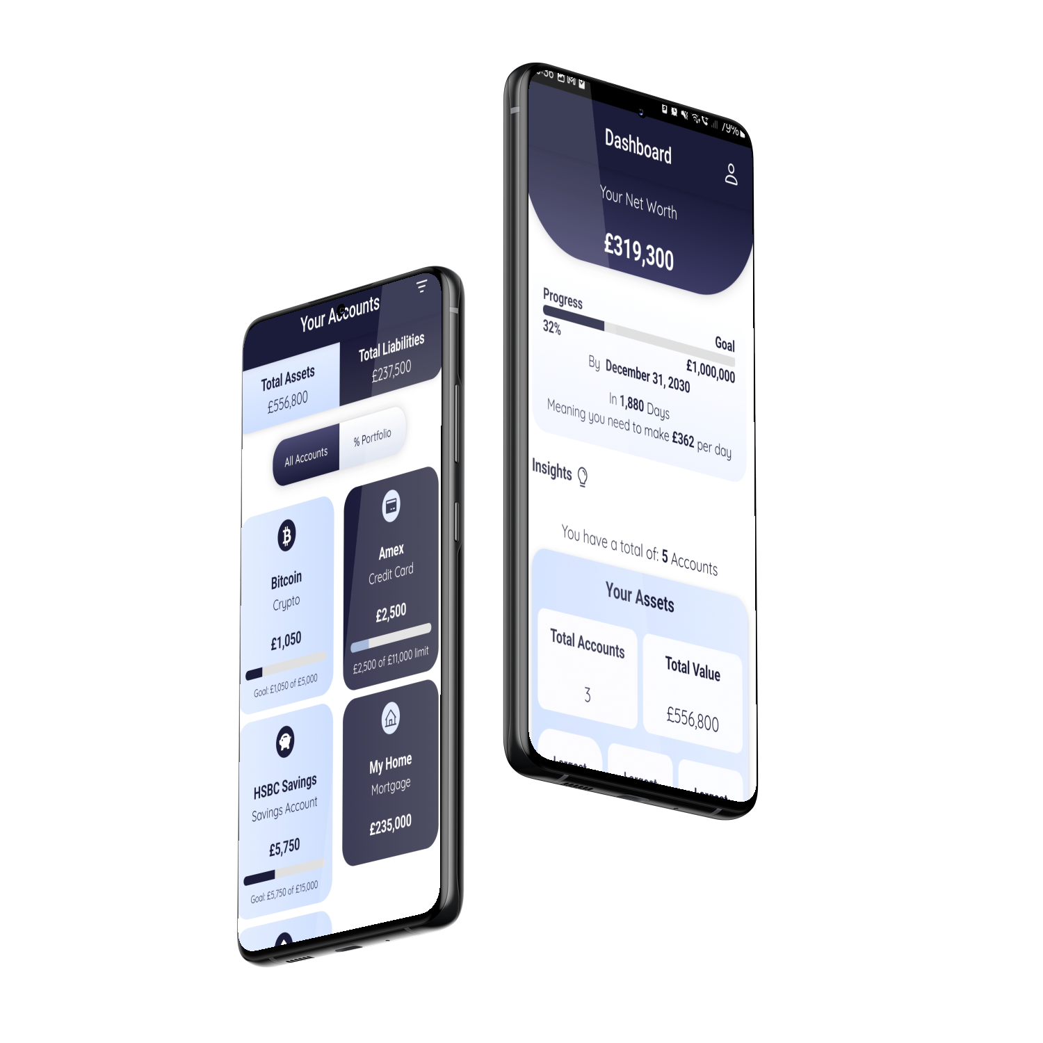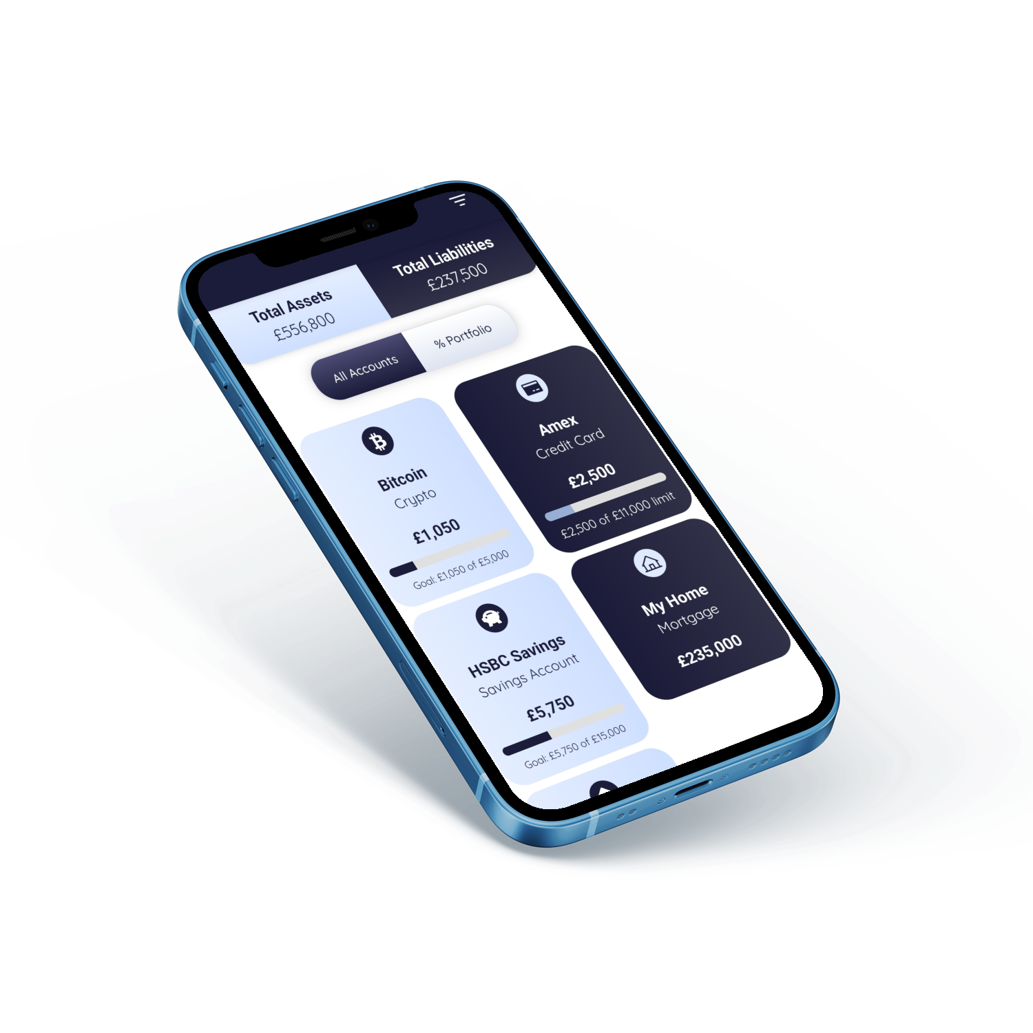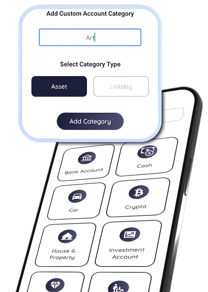 From Assets like Bank Accounts, Savings, Investments and Pensions, through to Liabilities like Credit Cards, Mortgages and Loans